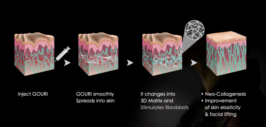 GOURI is not a filler with a localized impact or a temporary skin booster, it is a unique injectable that smoothly spreads into the entire face without complication as it is solubilized, biodegradable, and biocompatible.
