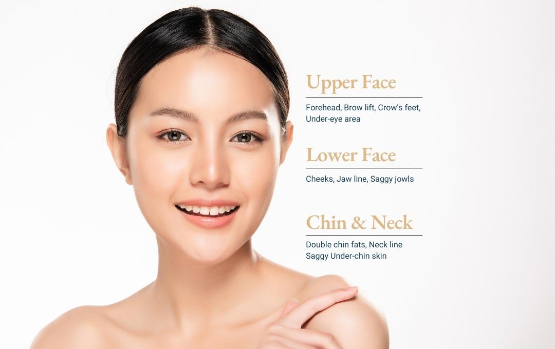 It targets deeper layers of the skin without damaging the surface, providing face-lifting and skin-tightening effects. The facelifting treatment can be used on the face and neck to reduce wrinkles and sagging skin, as well as treat areas such as a double chin or saggy jowls.